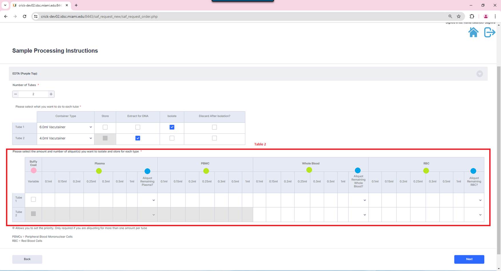 In the example below the user added a new 10ml Vaccutainer tube for DNA extraction. Once the user is satisfied with the changes, they can click on the ‘Next’ button.