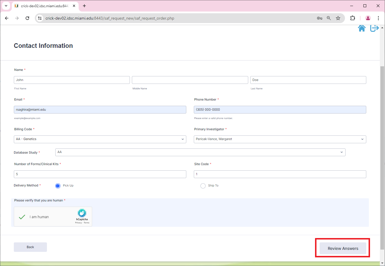 Name, email, phone number, billing code, PI, database study, number of forms/clinical kits, site code and delivery method. Once that information has been filled out the user will verify that they are human via captcha, and proceed to review the answers