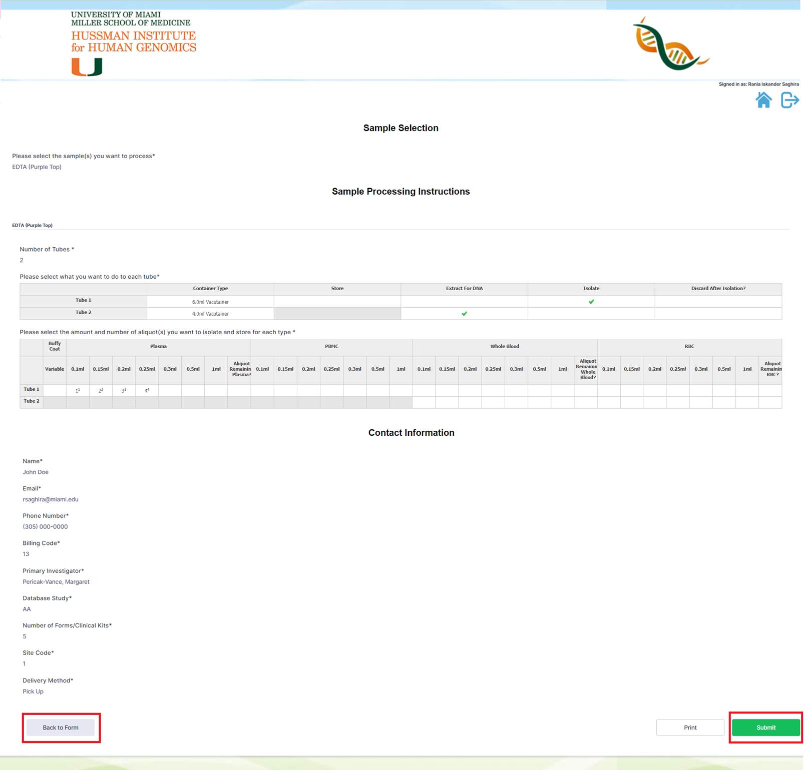 Once the user has completed all the tube instructions. They can click on next to fill out the contact information.