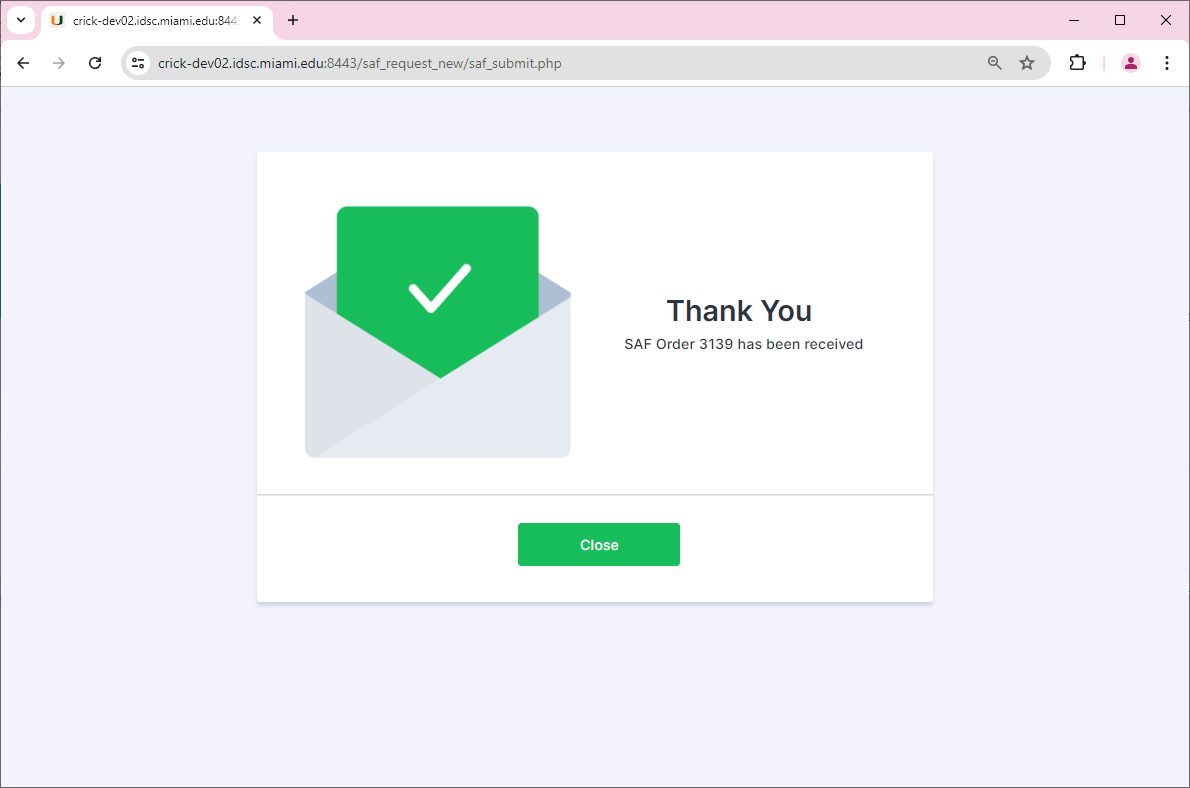 Once the order has been submitted. The screen will display a thank you page along with the new SAF Order number.