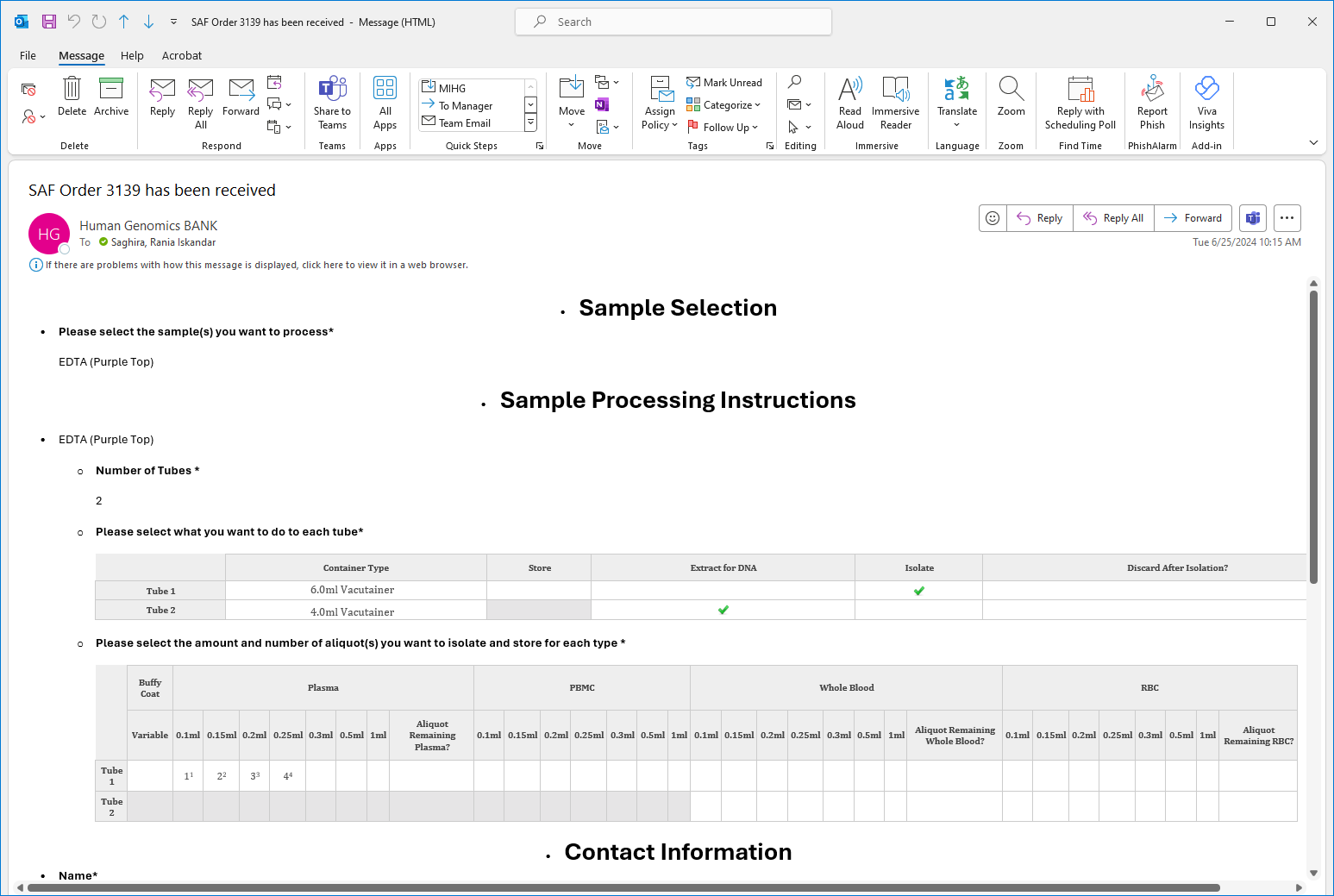 The revamped SAF Order Request Form will allow users to request blood, fluid, tissue and other kits along with the ability to add processing instructions for each.