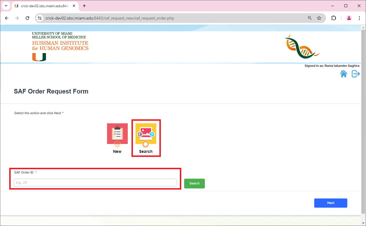 Users will now have the ability to clone an existing SAF Order when submitting a new request. In order to do so, go to the main page and click on search. The SAF Order ID field will show up.