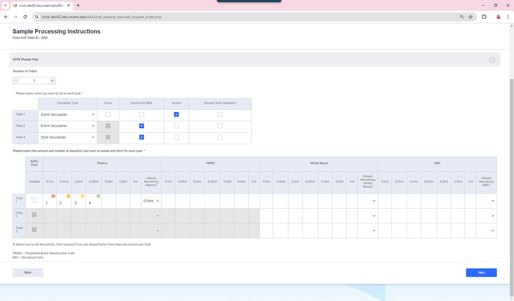 The next page, will allow users to specify how many tubes and what processing instructions should applied to each tube for each category