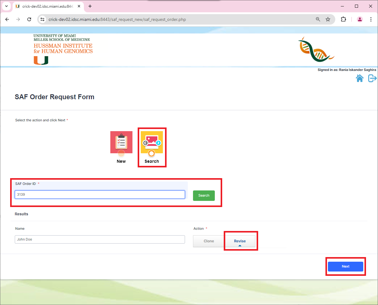 There are instances in which the user will need to revise an existing SAF Order to make some changes. To do this, the user will send an email to hihgbank@med.miami.edu with the SAF Order ID specifying that they need to revise the order.