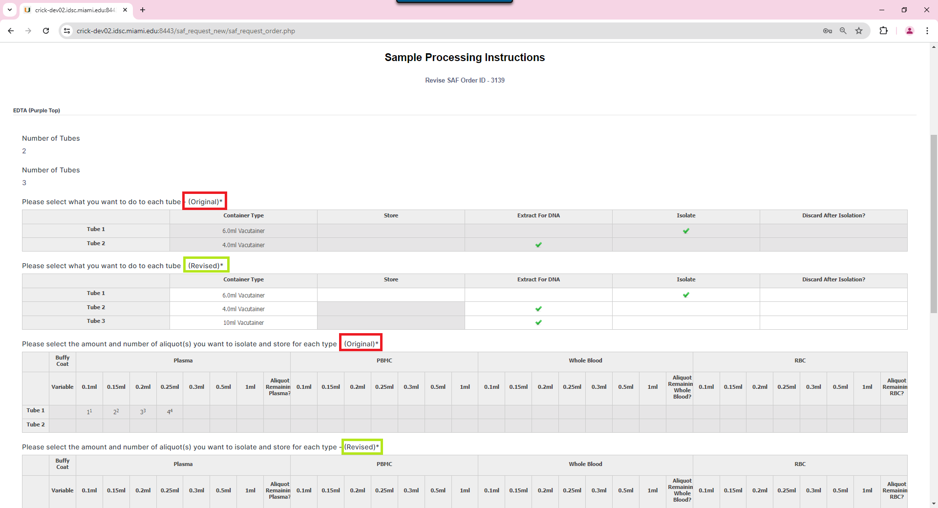 The sample processing instructions page will display the original instructions for each tube next to the revised one. The user can edit the revised ones to make changes.